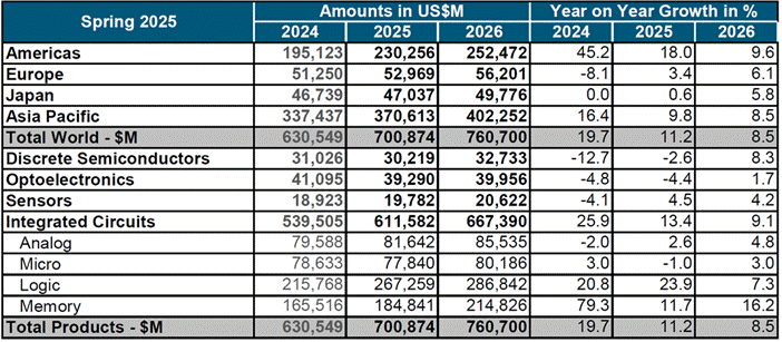 WSTS指出,繼2024年強(qiáng)勁反彈之后,預(yù)計(jì)2025年全球半導(dǎo)體市場(chǎng)將增長11.2%,總價(jià)值將達(dá)到7009億美元。這印證了WSTS對(duì)行業(yè)持續(xù)增長的預(yù)期。此次擴(kuò)張主要得益于邏輯和存儲(chǔ)器領(lǐng)域持續(xù)強(qiáng)勁的勢(shì)頭,預(yù)計(jì)這兩個(gè)領(lǐng)域都將實(shí)現(xiàn)強(qiáng)勁的兩位數(shù)增長,這得益于人工智能、云基礎(chǔ)設(shè)施和先進(jìn)消費(fèi)電子等領(lǐng)域的持續(xù)需求。此外,傳感器和模擬等細(xì)分領(lǐng)域預(yù)計(jì)將做出積極貢獻(xiàn),盡管增長較為溫和。